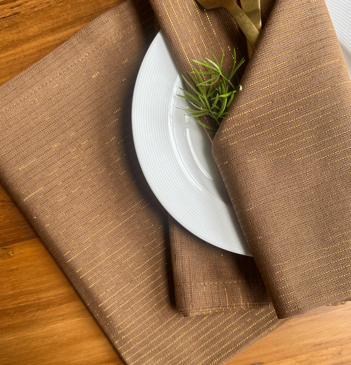 Zari Stripes Sage Green Table Runner & Brown Napkins Combo