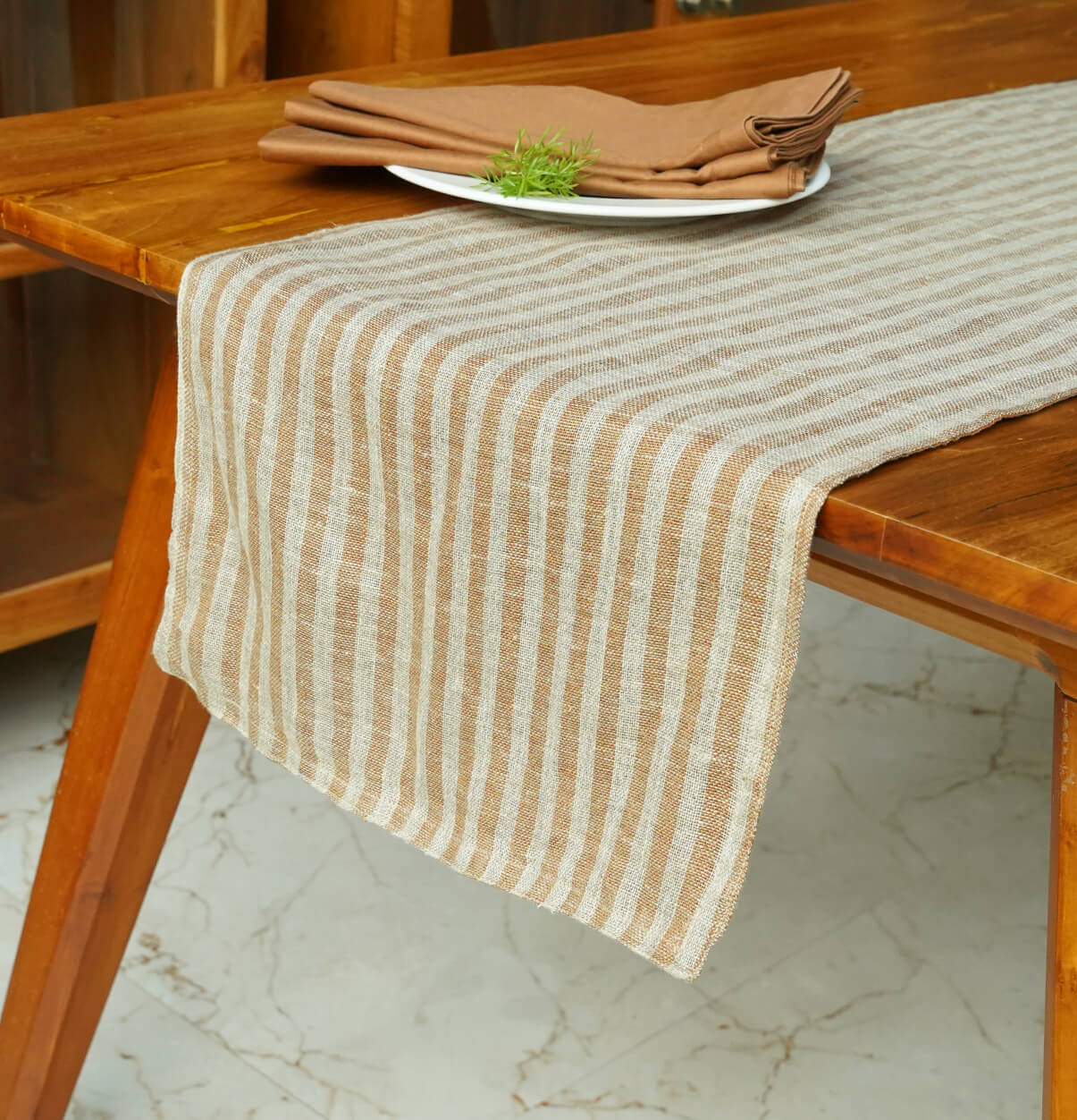 Twin Stripes Orange Linen Table Runner & Brown Napkins Combo